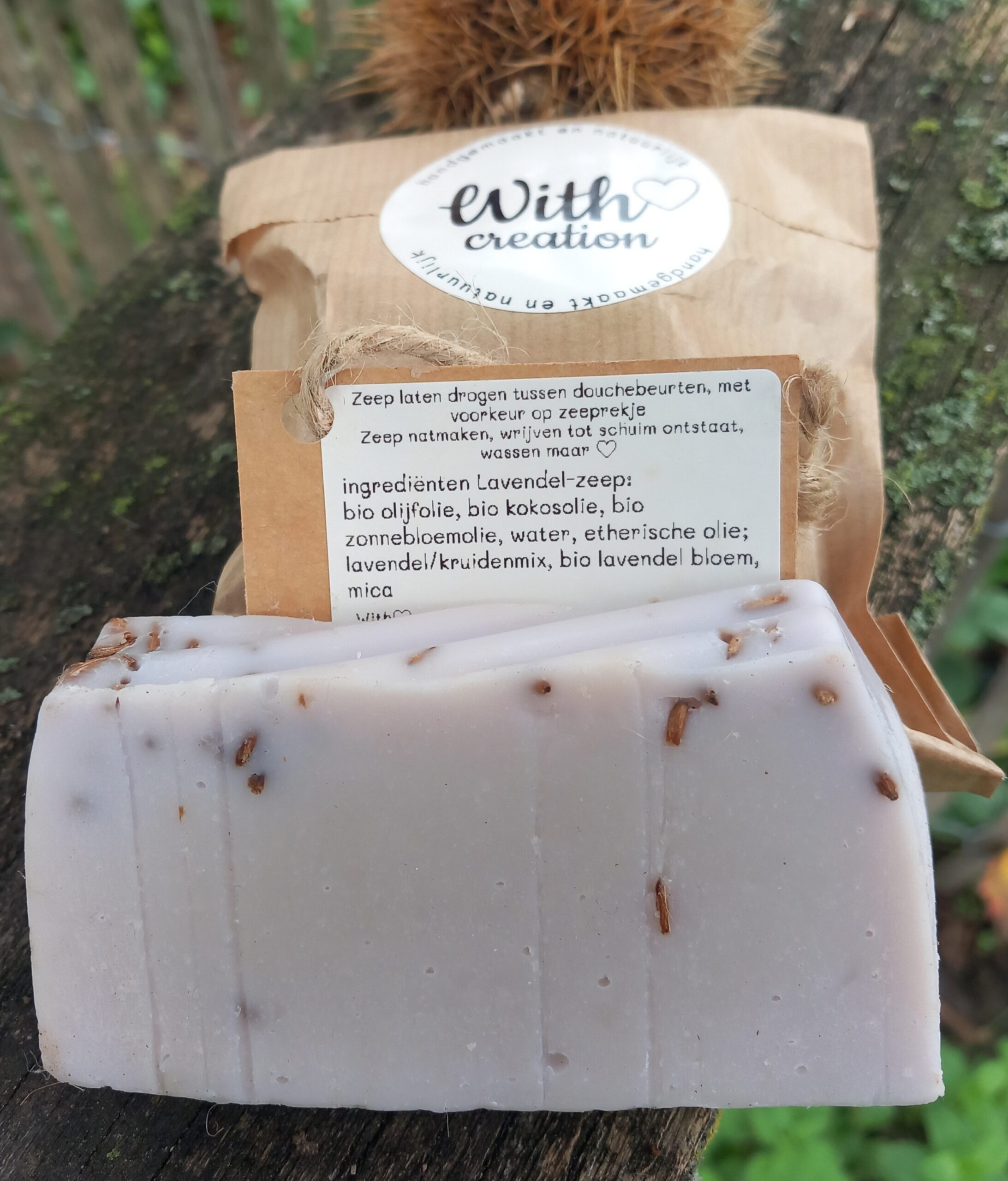 Verzorgende zeep, handgemaakt en natuurlijk. Voor de normale tot gemengde huid. In principe ook te gebruiken als shampoo.